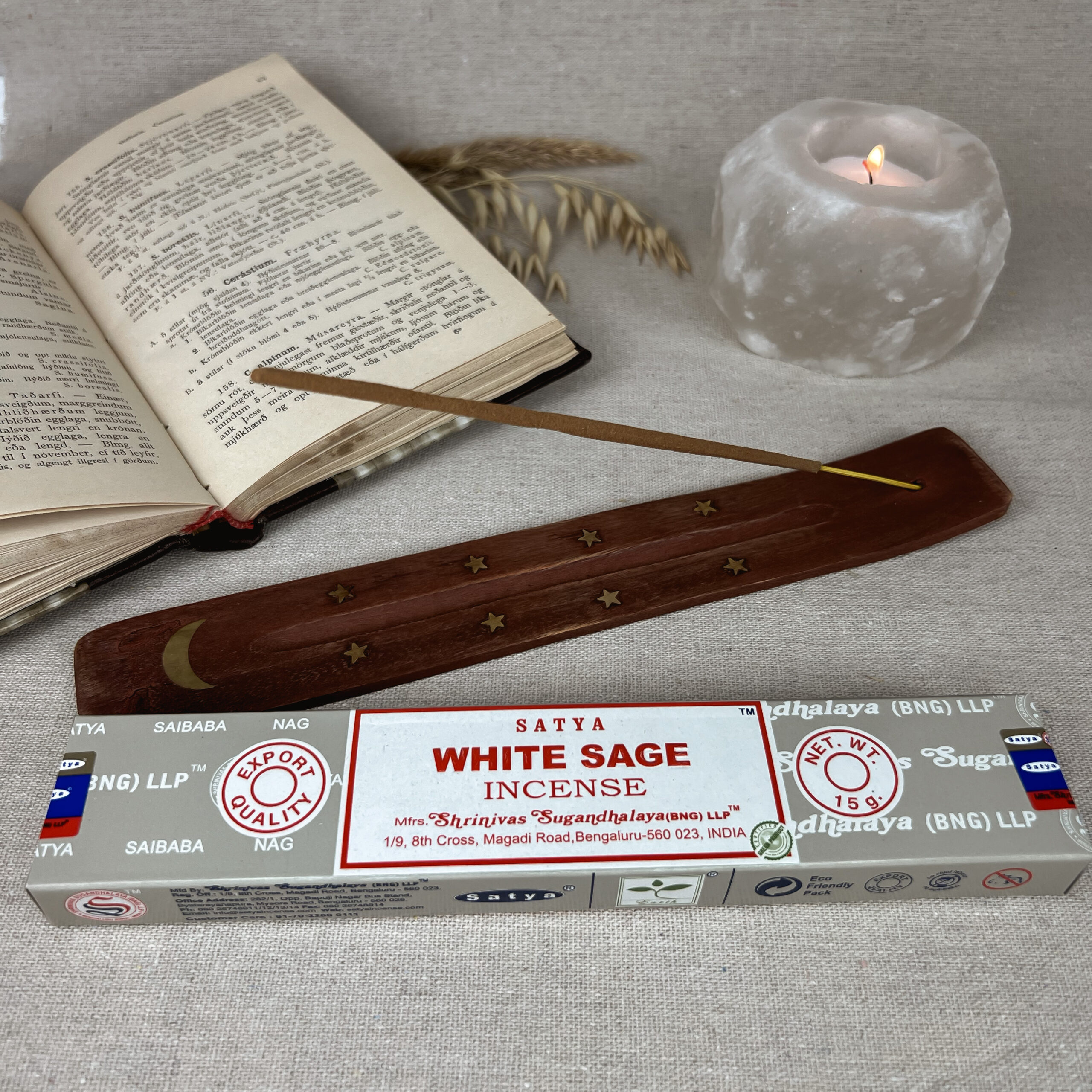 Deze set bevat witte salie wierookstokjes die zijn doordrenkt met de zuiverende eigenschappen van witte salie, bekend om zijn vermogen om negatieve energieën te verdrijven en ruimtes te zuiveren. Plaats eenvoudig een wierookstokje in het bijgeleverde plankje, steek het aan en laat de heerlijke geur van witte salie zich verspreiden door de ruimte terwijl je geniet van een moment van ontspanning en meditatie.